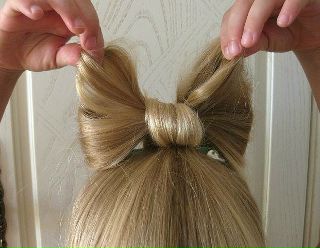 Шаг 4. Разверните волосы, чтобы получился бант. Оставшийся хвостик используйте для серединки.