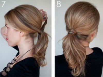 - объёмный и красивый хвост на голове. Если вы хотите сделать ваш хвост особенно эффектным, то воспользуйтесь следующими рекомендациям по созданию объёмного хвоста. Отделите верхнюю часть волос и тщательно начешите её у корней. Слишком не усердствуйте. Пряди не должны выглядеть после начёса словно мочалка. Теперь соберите волосы в низкий хвост. Затем вам нужно слегка вытянуть из хвоста верхнюю часть волос, которую вы начесали. Делайте это плавно, максимально стараясь не повредить общую структуру причёски. При помощи мелкого гребешка причешите волосы спереди и по бокам, фиксируя их лаком для волос. Чтобы скрыть резинку для волос, отделите тонкую прядь из хвоста и оберните ею резинку. Кончик пряди спрячьте под хвостом, фиксируя её под резинкой внутри.