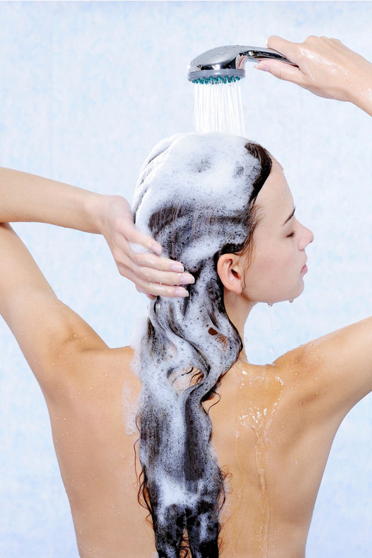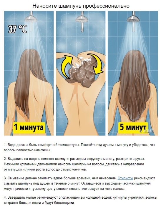 1. Вода должна быть комфортной температуры. Постойте под душем с минуту и убедитесь, что волосы полностью намочены.
