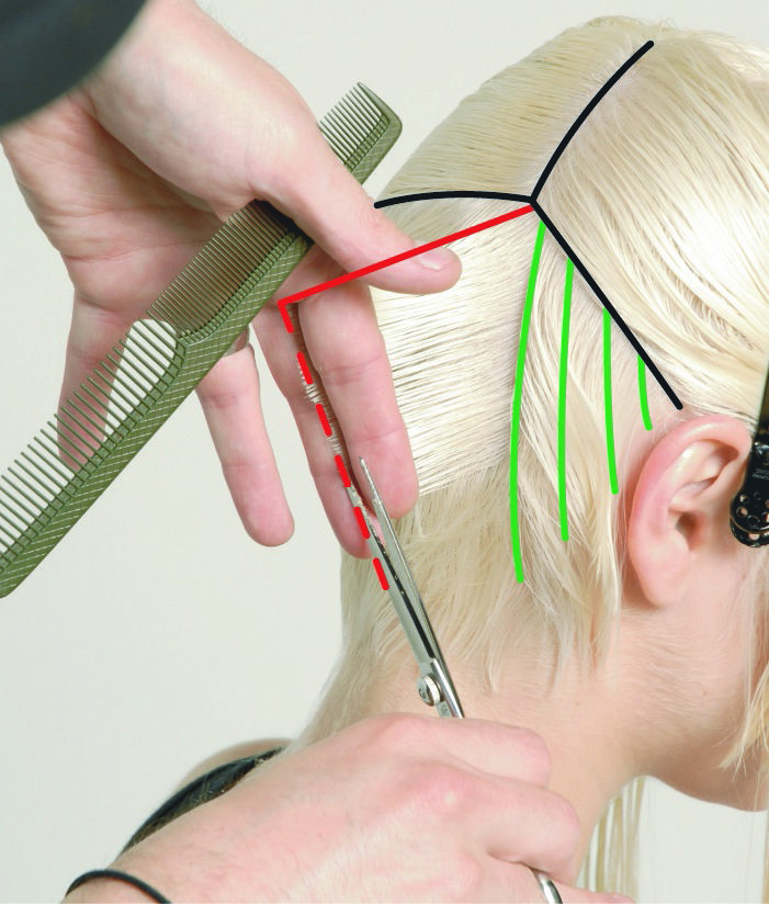 ШАГ ЧЕТВЕРТЫЙ ‘ПОВТОРИТЬ’: Отрежьте ломтик толщиной в дюйм от исходного пробора над ухом к лицу и подстригите его по ходу дела. Используйте волосы, которые вы видите сзади, в качестве ориентира. Повторяйте это до тех пор, пока не останется больше секций.