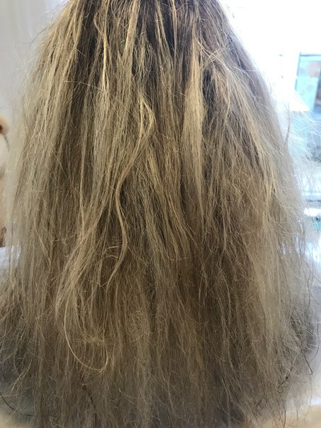Те кто постоянно красятся, уже понимают, что это было непростительной ошибкой, но на этом все не закончилось, мне не понравилось быть брюнеткой (ну не мое это) и я решила снова стать светленькой ( и сначала я воспользовалась смывкой чтобы вывести темный цвет, волосы после этого были похожи на капроновые ниточки и выглядели как желтая мочалка, так ходить разумеется было невозможно и мастер сказала, что единственный вариант это обесцвечивание и тонирование поверх, вариантов не было и пришлось пойти на такие крайние меры.