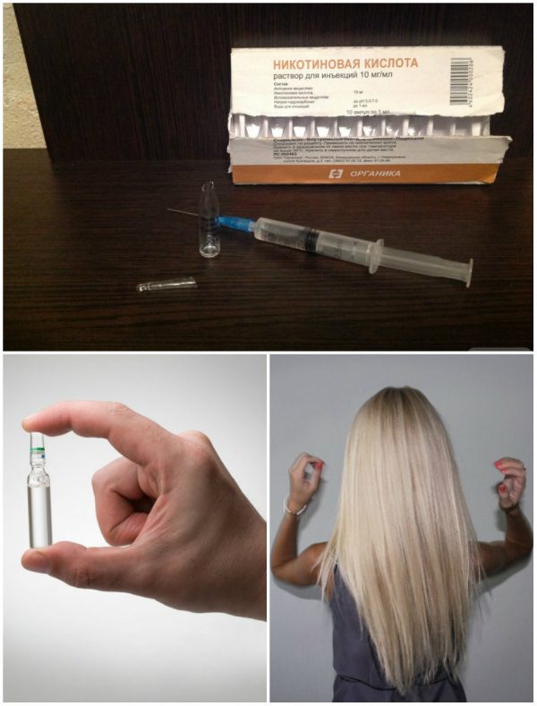 Никотиновая кислота для волос (не путать с ампулами для инъекций) выпускается в виде раствора. По инструкции, его наносят на предварительно вымытые голову и волосы массирующими движениями. После — раствор не смывают.