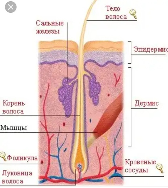 Эпидермис — это самый внешний слой кожи. Каждый волос возникает из-за углубления на эпидермисе.Волосы состоят из двух частей: