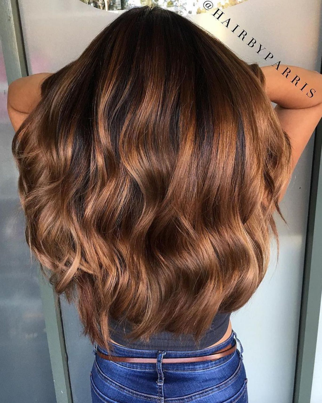 Выпрямите волосы и сделайте легкую легкую взъерошенную прическу по краям, чтобы подчеркнуть красивый металлический карамельный оттенок.