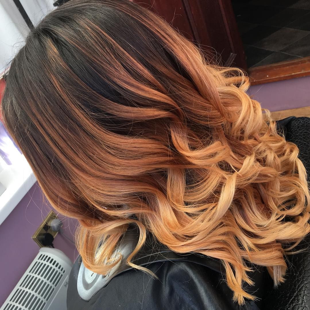 Если у вас есть время и бюджет, чтобы броситься на сенсационный цвет волос, пусть омбре на закате будет тем, что вы выберете. Для этого образа ваш стилист смешает корни черного дерева с оранжевыми, красными и желтыми тонами по всей длине и на концах.