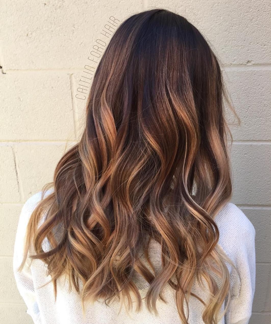 каштановые волосы с густой карамелью мелирование и кудри плюс более легкие кончики ириски для игривости — отличная идея