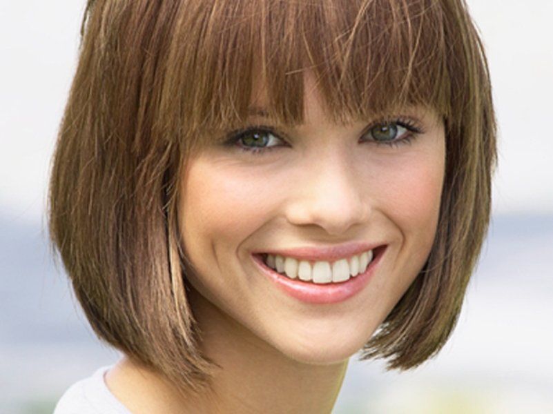 - лицо в форме сердечка — в этом случае идеален вариант, когда боковые пряди длиной до подбородка или чуть ниже, а челка густая и прямая, таким образом, мы корректируем слишком широкий лоб и узкий подбородок.