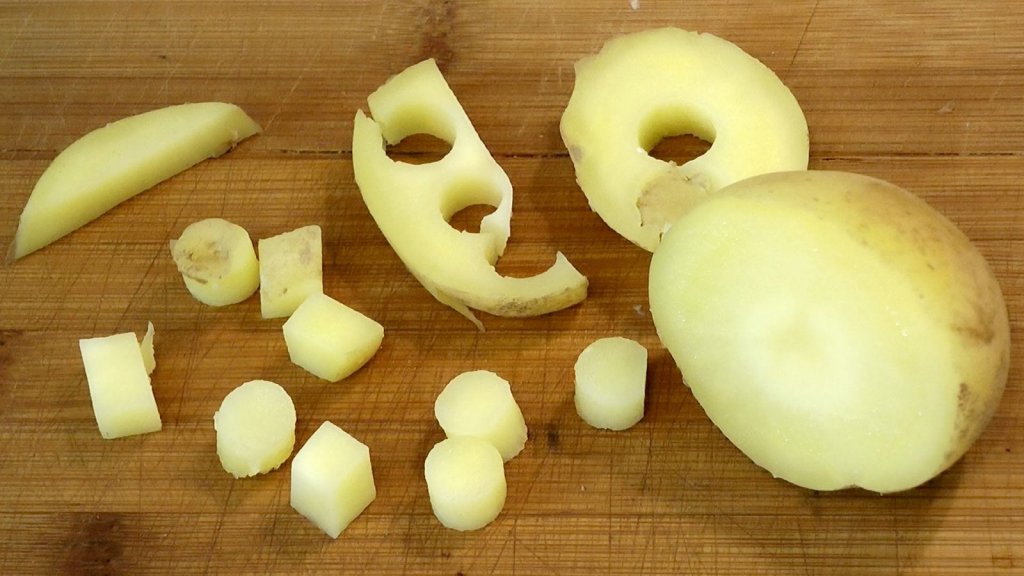 - Помойте картофель, очистите от кожуры и нарежьте на кусочки.