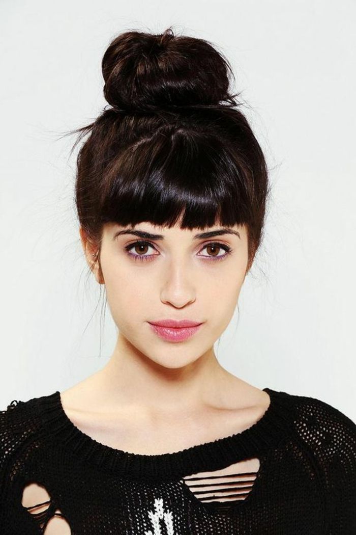 Вот еще одна легкая прическа с челкой-шторкой. Нет ничего проще, чем наполовину собранный хвостик, завязанный в небрежный пучок. «Неряшливое» ощущение прекрасно переносится с помощью челки с занавесками.