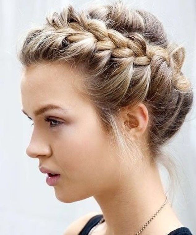 Заплетите одну боковую часть в голландскую косу. Заплетите волосы вдоль изгиба головы, пока не дойдете до передней части с другой стороны. Сплетите оставшиеся волосы из коронной косы в обычную косу и поместите ее спереди, чтобы закончить корону. Соберите оставшиеся волосы в высокий хвост и вставьте пучок в его основание. Разделите хвост на четыре части и закрутите каждую до конца. Оберните и закрепите изгибы вокруг булочки-пончика, чтобы получилась скрученная булочка. Завершите прическу несколькими брызгами лака для волос.