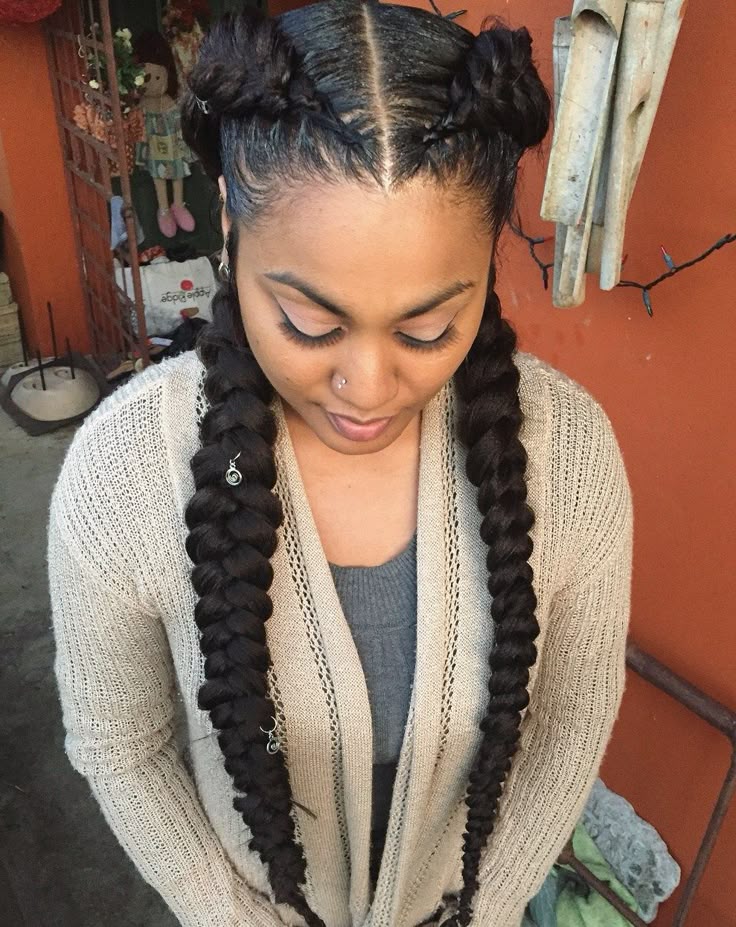 Это один из лучших примеров того, насколько универсальными могут быть прически с косами для женщин с черными волосами! Он имеет косички по бокам головы, двойные косы и цветные плетения, что делает эту прическу «универсальной». Вы можете носить этот образ для любой повседневной или официальной церемонии.