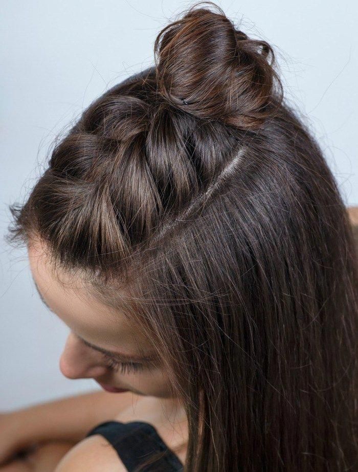 Это одна из самых простых, но классических причесок для черных волос. Во-первых, разделите волосы на две части с помощью пышного бокового пробора, чтобы добиться такого вида. Затем начните заплетать эти две части от линии роста волос и соедините эти две косы на затылке в виде скрученного пучка. Если у вас короткие волосы, вы можете использовать наращивание волос до необходимой длины, чтобы получить такой вид.