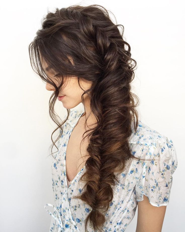 Это один из лучших вариантов прически с косами для женщин с черными волосами, которые можно выбрать для свадебных церемоний. Во-первых, разделите волосы на несколько секций и вставьте скрученное удлинение в каждую секцию после нанесения воска для волос. Затем заплетите все косы с одной стороны плеча.