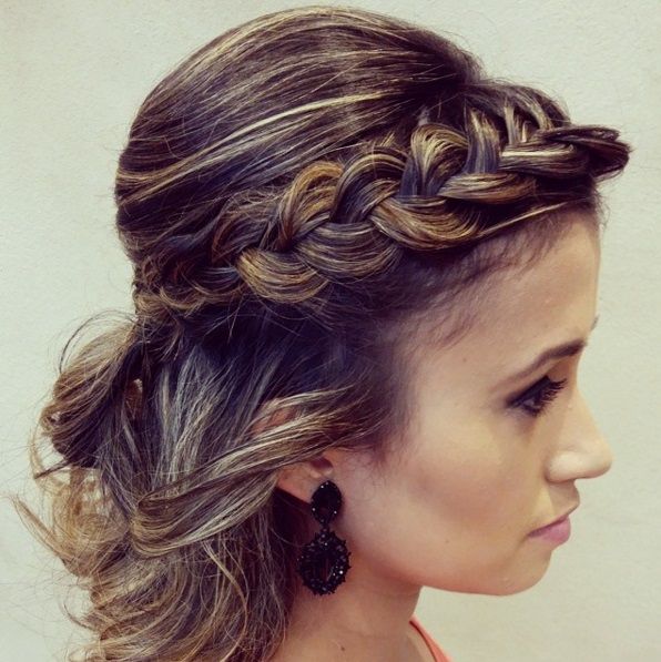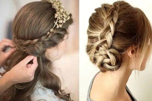 Выполнить такую прическу несложно и самостоятельно. Для ее создания вам понадобится тонкая резиночка и шпильки. Оплетите вокруг головы тонкую косичку, завяжите ее. После соберите вместе с ней распущенные волосы в пучок и все закрепите шпильками. При желании и если позволяет ситуация, волосы можно украсить искусственными цветами.