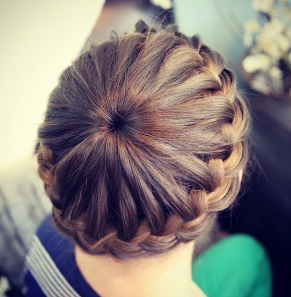 Шикарное использование кос, замечательно подходит для вечернего варианта прически. Для более аккуратного выполнения лучше попросить помощи, чтобы волосы на голове были уложены идеально. Для того чтобы прическа была гладкой, следует предварительно наложить мусс по всей длине волос.
