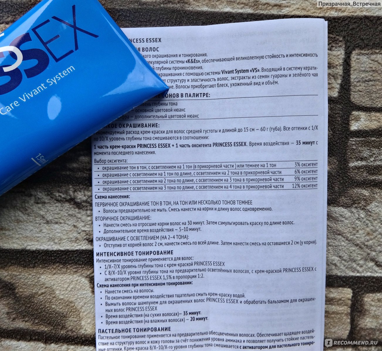 | СТОЙКОЕ ОКРАШИВАНИЕ | Краска Princess Essex 60мл | Смешивание 1:1 | Оксигент 60мл | 35 минут |