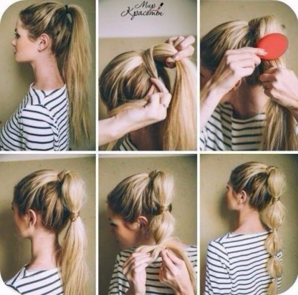 Создать на области макушки хвост, поделить его на 3 секции, которые будут иметь разную толщину. Каждую прядь обработать лаком, чтобы волоски были гладкими. Взять самую тонкую прядь и обмотать около хвоста, а кончик закрепить заколкой.