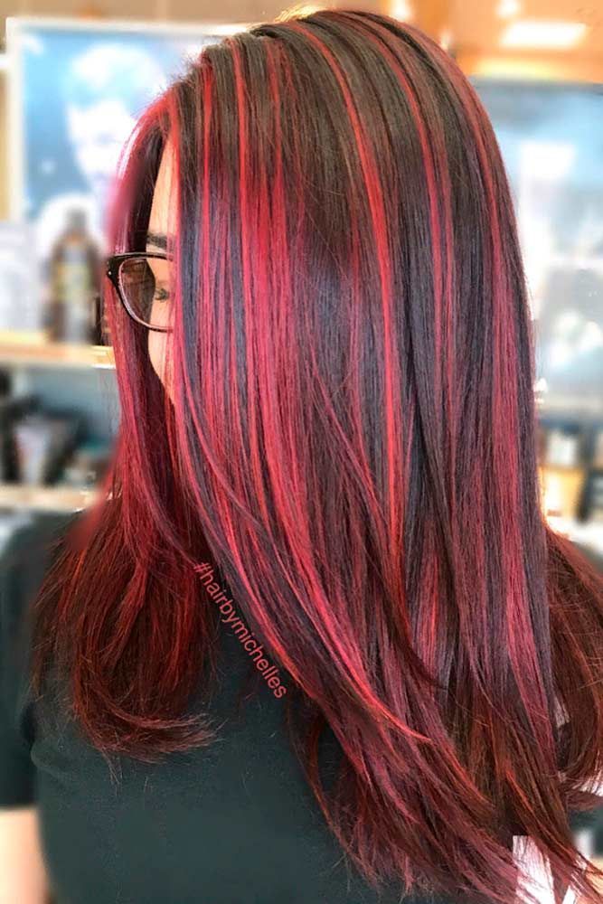 Нам нравится этот теплый темный оттенок красного. Он не такой темный, как некоторые из предыдущих красных цветов, которые мы вам показывали, но имеет хорошую среднюю глубину. Нет ничего лучше, чем светлые пряди, чтобы осветлить темный цвет волос. Смешивание блондинки дает великолепный смешанный вид.