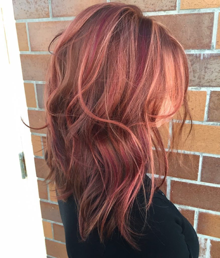 Это более темные рыжие волосы со светлыми бликами — идеально подходит для осенних и зимних месяцев, когда многие из нас склонны больше полагаться на более темный цвет волос. Нам нравится ярко-красный оттенок, смешанный в некоторых частях волос для небольшого неожиданного цвета в дополнение к коротким светлым бликам.