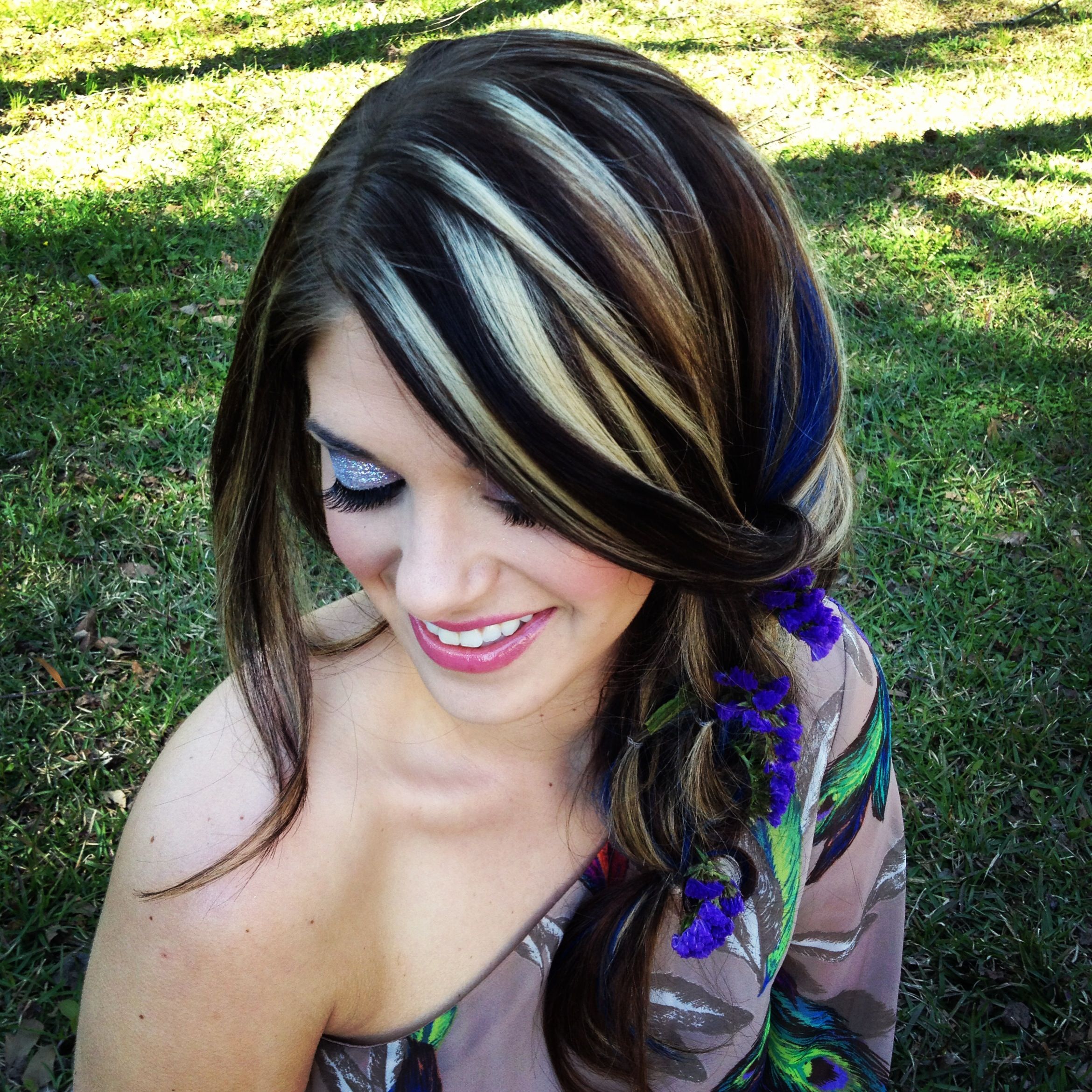 - Создать визуальный объем поможет техника Peek-a-Boo. Она заключается в использовании ярких и темных оттенков в нижней части прически. Чтобы подчеркнуть черты лица полоски насыщенного цвета сосредотачиваются в области висков и на челке. Яркие полоски экстравагантных расцветок подходят отважным девушкам. При этом широкие пряди окрашиваются в цвета, которые резко контрастируют с основным тоном волос.