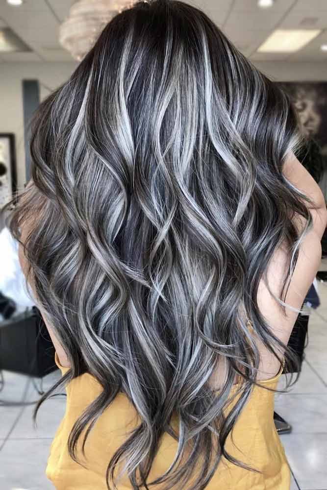 Темные брюнетки с пепельными оттенками — одни из наших любимых образов. Этот стиль включает в себя высокий контраст с бликами, начинающимися очень близко к корням. По мере того, как вы двигаетесь вниз по длине, образ становится пепельно-серым, создавая красивый эффект выметания.