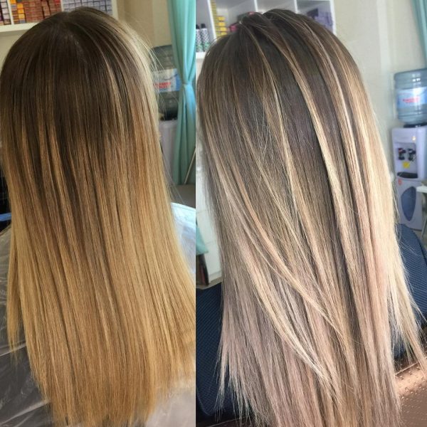 Так как при данной технике не используется фольга, то пряди ложатся друг на друга, оттенки смешиваются, что даёт более нежный и плавный переход.
