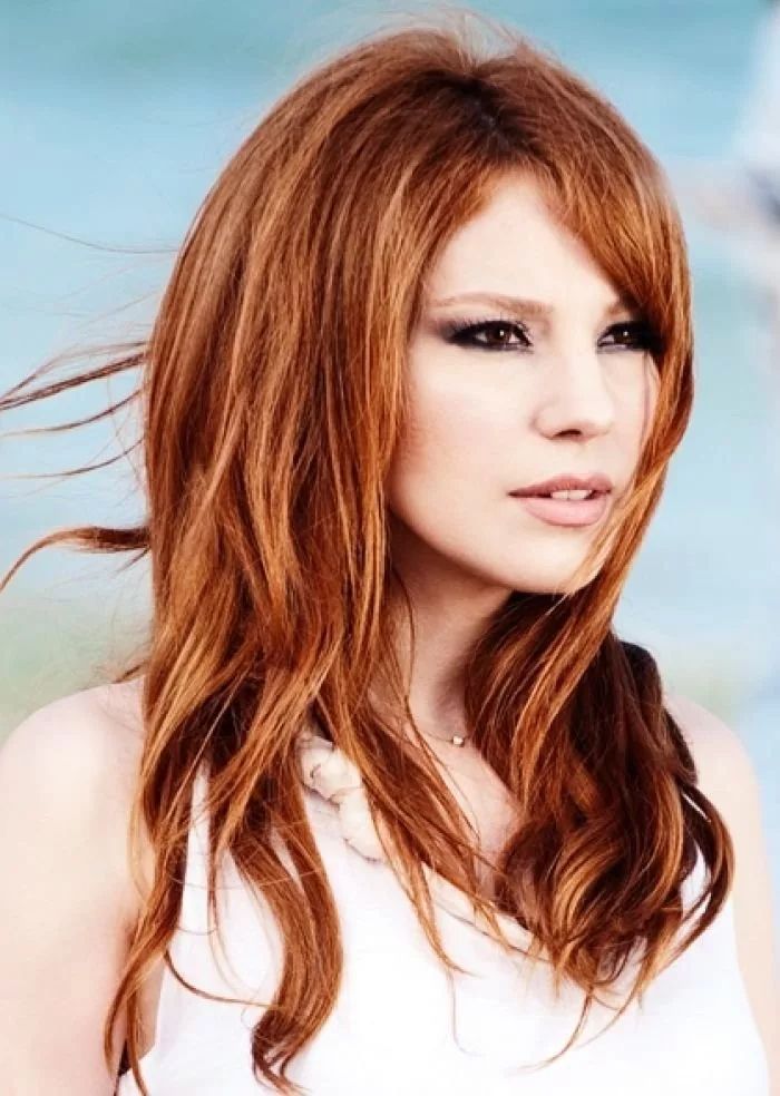 16. Многослойные светло-каштановые рыжие волосы с изогнутой челкой: