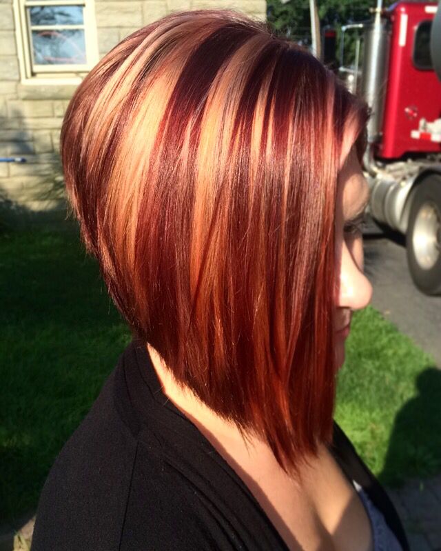 Красновато-коричневый — лучший оттенок для прямого боба со слегка изогнутыми концами. Вы должны создать боковую часть и выбрать несколько мягких черных бликов, чтобы получить именно этот вид.