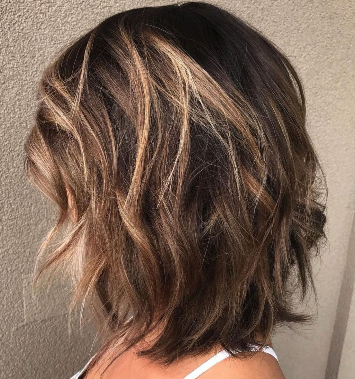 6. Длинный боб и карамельное мелирование на каштановых волосах
