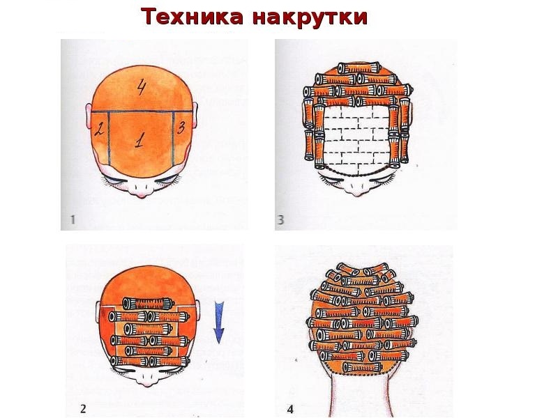 Крепят двумя шпильками, пиками или палочками, протыкая бигуди с двух сторон. Накрутку затылочной и височной зон также осуществляют на бигуди и крепят в вертикальном положении.