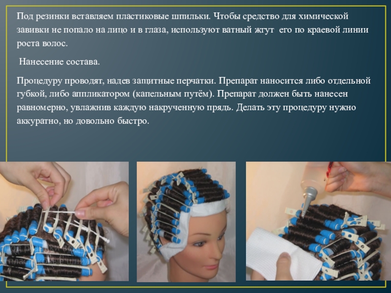 Когда все волосы накручены на коклюшки, на каждую коклюшку быстро и равномерно нанесите состав для завивки.