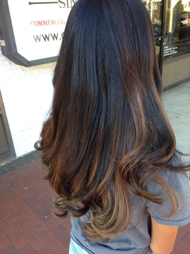Карамельные блики добавляют красивый контраст темным темным волосам.