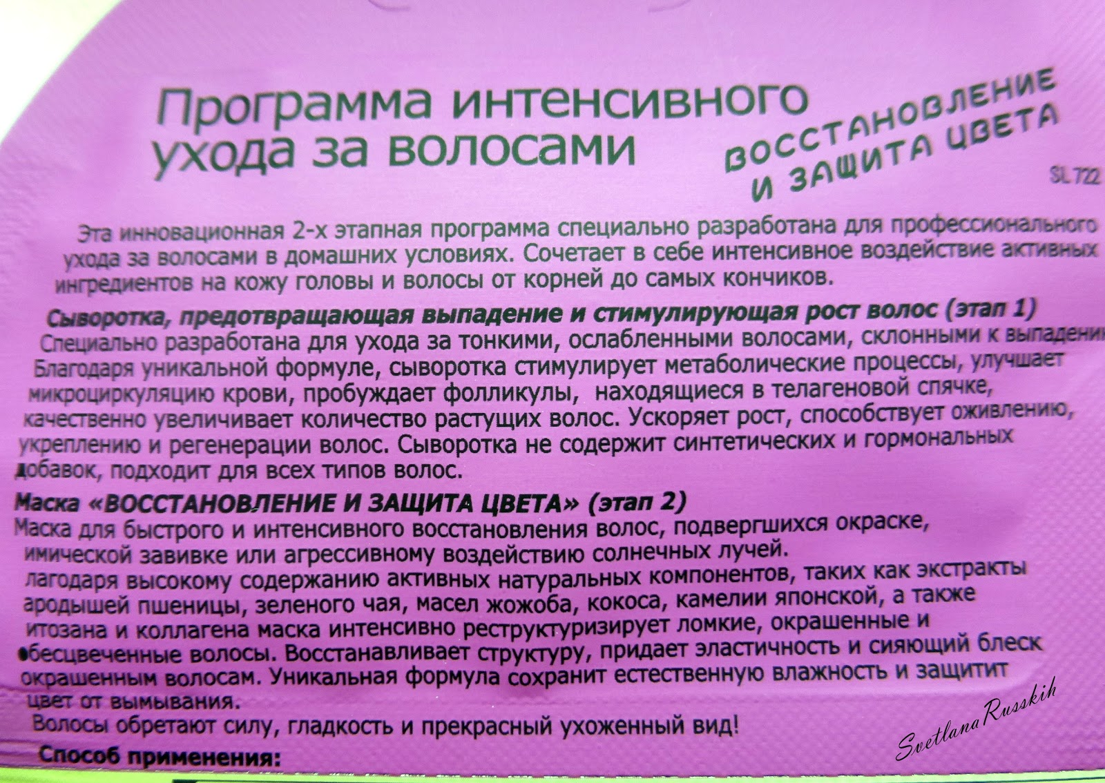 Нанесите жидкость на сухие пряди и укутайте поверх шапочки для душа полотенцем. Через два часа смойте состав с шампунем. Состав подходит для частого применения, не лишая причёску объёма.