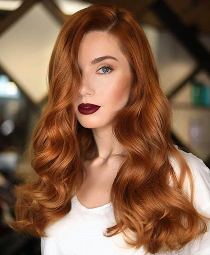 Насыщенный рыжий цвет представлен здесь в виде темного оттенка, который словно заглушает рыжину на волосах. Чтобы получить подобный тон мастера смешивают между собой медный оттенок и фиолетовый, что в итоге образует темно-рыжий.