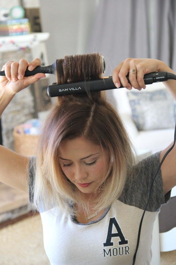 После того, как вы нанесли термозащитный спрей, используйте обжимной утюжок. Поднимите верхний слой волос, чтобы он не мешал, и завяжите корни под ним. Вам нужно только завить волосы ближе к голове, потому что вы просто хотите немного приподнять для объема. Используйте щипцы для завивки вместо щипцов для завивки, потому что волнистый рисунок щипцов для завивки заставит ваши волосы действовать почти как полка для слоя поверх них.