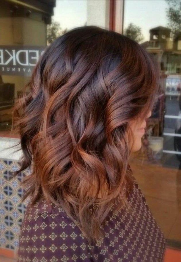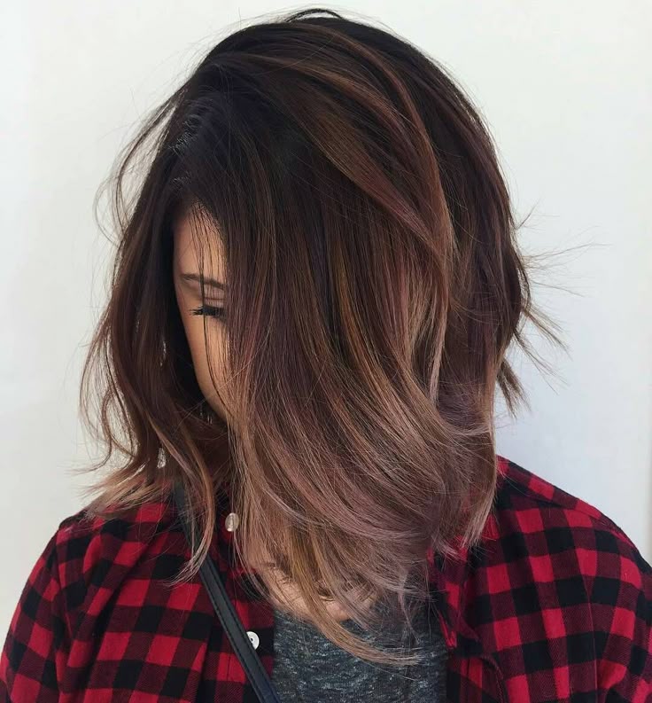 Этот образ представляет собой темно-каштановую основу волос с бордовым оттенком у корней и карамельными бликами — мягкими и лестными с легким оттенком края. Концы волос уложены в короткие локоны, которые слегка взъерошены, чтобы создать более естественный вид со здоровой дозой несовершенства, поощряемой во всех современных прическах.