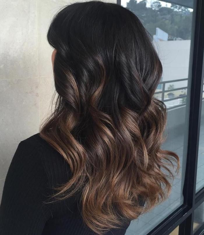 На длинных локонах омбре на темных волосах обладает отличным воплощением благодаря использованию нескольких тонов для перехода. Одинаково стильно будет смотреться как осветление черных локонов к золотисто-коричневому или медному тону, так и приближенные к черному цвета на темно-русых или каштановых прядях.
