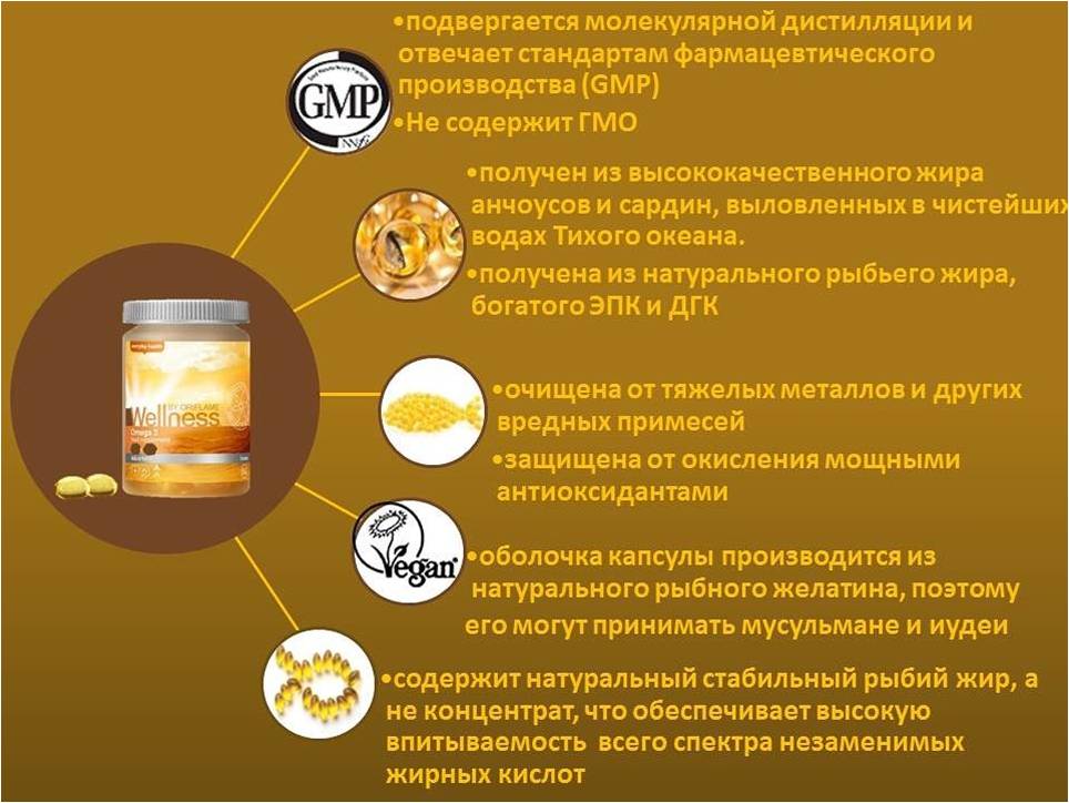 Как выбрать Омега-3 комплексВ качественном Омега-3 комплексе содержание жиров животного и растительного происхождения должно быть не менее 60%, суммарно не меньше 300 мг в одной капсуле. Качественная добавка будет очищена от лишних примесей и паразитов, это гарантируют стандарты качества и безопасности GMP и GOED. Не следует выбирать продукт, в котором есть красители и консерванты. Лучше всего покупать Омега-3, полученный из тушек морской рыбы, а не из ее печени.ВопросыНа популярные вопросы РИА Новости ответила нутрициолог, натуропрактик Анна Елькина.Кому нужно принимать омега 3?— Омега-3 защищает от депрессий, сезонных аффективных расстройств, послеродовой депрессии. При депрессии используют в лечении Омега-3 в дозе от 2 грамм в сутки. Они влияют на когнитивные способности детей и взрослых (IQ). Также уменьшается риск аллергий и сердечно-сосудистых заболеваний на протяжении всей жизни. Рыбий жир, который богат Омега-3, повышает резистентность к инсулину, способствует сжиганию жира, снижает боль в суставах, останавливает сухость кожи, делает ее гладкой и бархатистой.