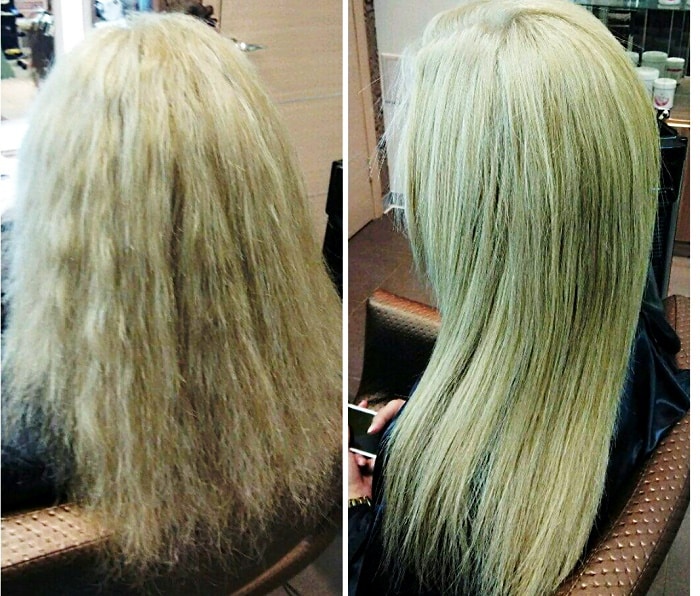 В отличие от многих процедур вытягивания, бразильское кератирование дарит волосам расслабление, естественное растяжение. Локоны станут податливыми, легкими, густыми, свежими.