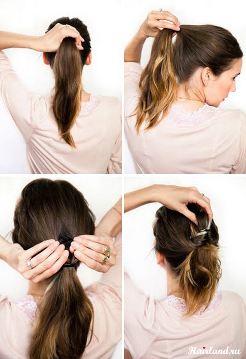 Важное составляющее лёгкой причёски на длинные волосы своими руками. Делается очень просто и совсем недолго, достаточно собрать хвост, а потом свернуть валиком: