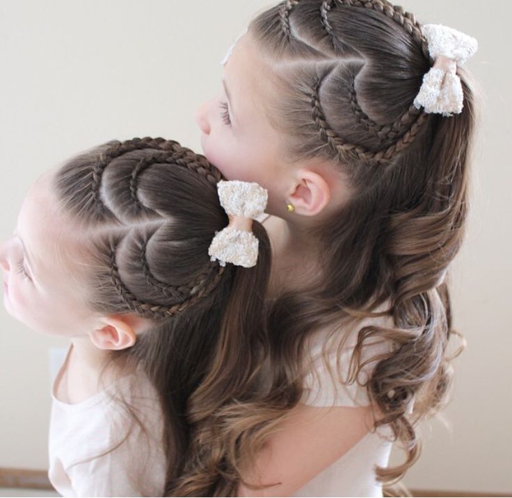 Два сердца. Если девочка обладает от природы длинными волосами, то в домашних условиях можно сделать ей простую, но достаточно креативную прическу. Для этого при помощи прямого пробора придется разделить локоны на 2 равных части. Далее с каждой стороны делается по одному хвостику. После этого можно приступить к формированию небольшого отверстия возле резинки и протянуть хвостик через нее. На следующем этапе волосы из каждого хвостика разделяются на 2 части и скручиваются. Так формируется сердечко, которое необходимо закрепить с помощью невидимки.