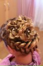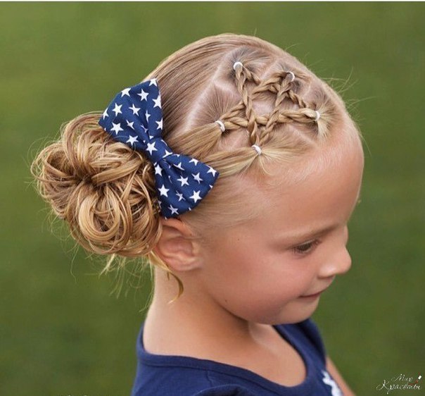 Вы можете создать интересную причёску, которую продумаете вместе с ребёнком. Например, можно создать интересные плетения на голове, завязать хвостики, соединить их между собой в интересный узор. Закрутив жгутики, вы можете создать самый необычный узор.