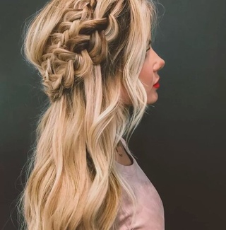 Самый простой вариант – завить кудри и заплести их сбоку, формируя «корону» которая послужит обрамлением для всей головы. Полученную «корону» можно украсить цветком или дополнить образ платьем в греческом стиле. Она хорошо сочетается с открытой шеей и плечами.
