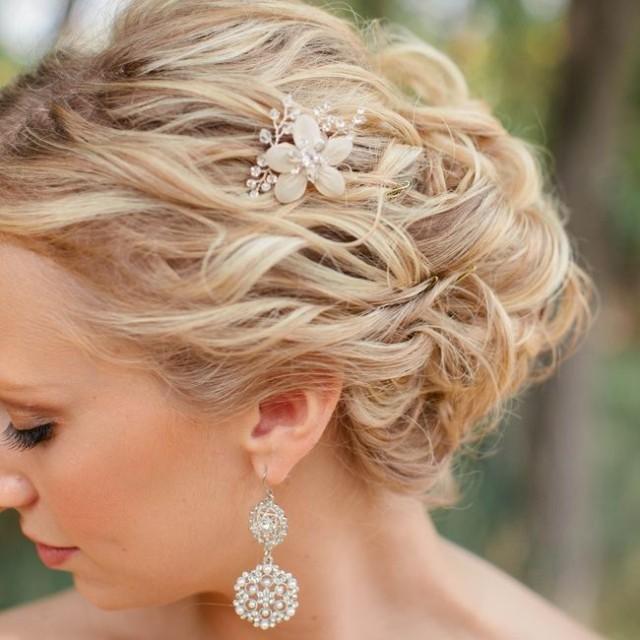Это хороший пример свадебных причесок для коротких вьющихся волос, где можно выбрать простую прическу в день свадьбы, используя изящные аксессуары для волос или повязки с жемчугом или блестящими кристаллами. Это придает столь необходимый шарм вашему образу.