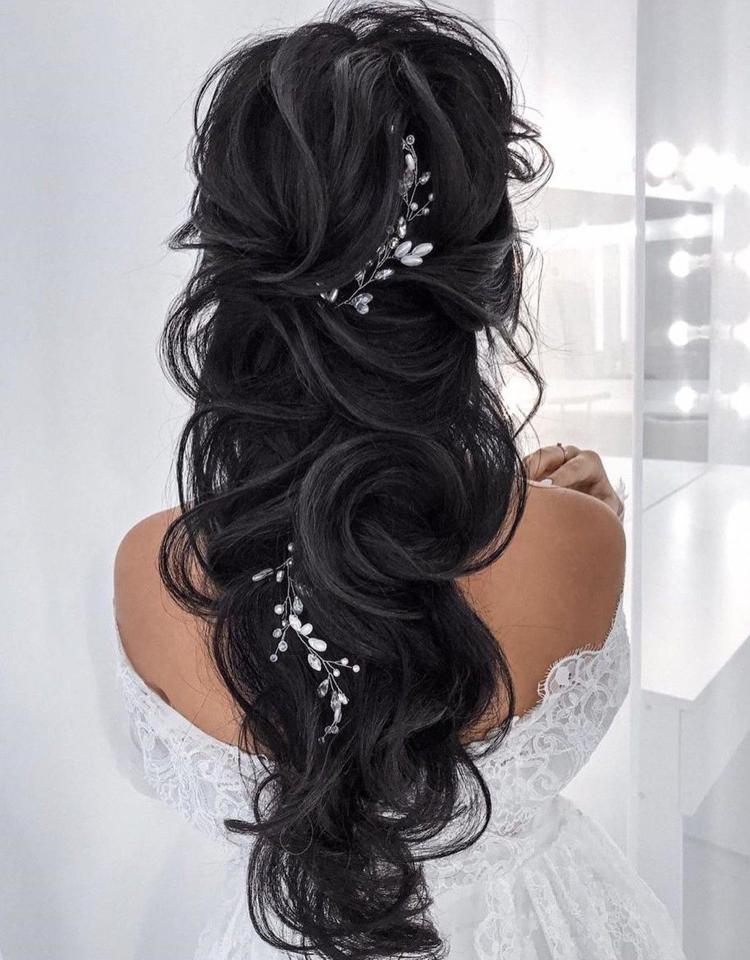Цветы и украшения – неотъемлемый аксессуар свадебной прически с длинными волосами