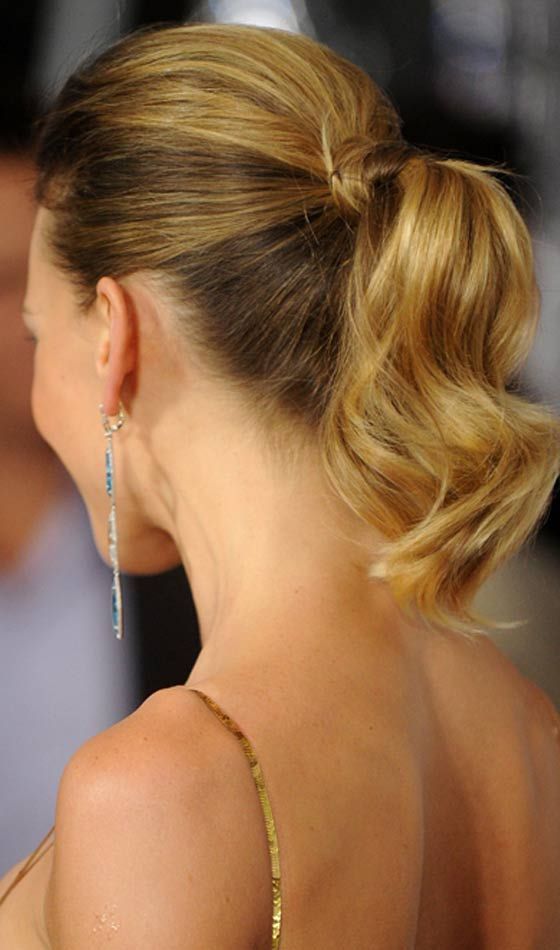 Довольно популярен также небрежно завязанный на затылке хвост. Секрет состоит в выбившихся из прически прядях. Смотрится просто шикарно. Не забудьте обернуть хвост прядью волос, чтобы скрыть резинку.