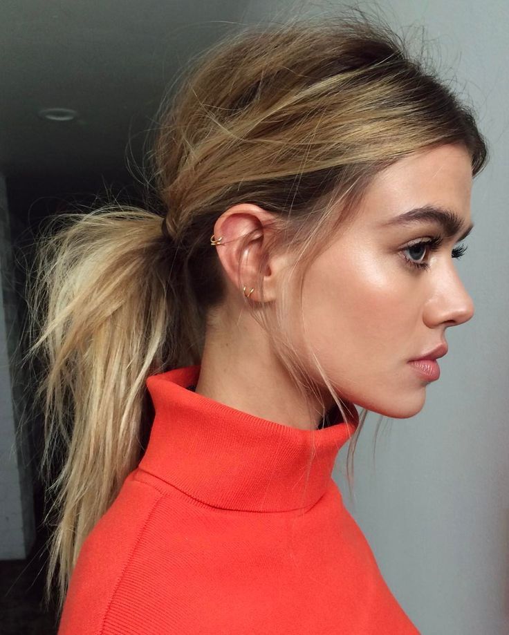 Этот образ представляет собой более интересную и уникальную версию классического конского хвоста, легко достижимого с помощью легкой помады. Время принять этот беспорядок.