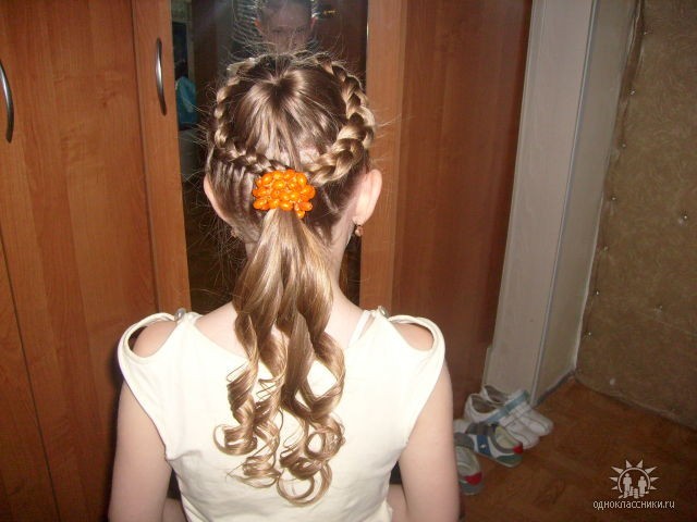 Обладательницам длинных волос не составит труда создать прическу дома. Самой простой и незамысловатой из них будет хвост. Если девочка не делает прически сама себе, с ней легко справится каждая мама. Так, если у вашей дочки волосы ровные и гладкие, их нужно слегка начесать у корней. Затем через 10-15 минут расчесать по всей длине, основу при этом не затрагивая. Теперь собираем волосы верхней части головы и закалываем зажимом, чтобы они не мешали. Оставшиеся пряди собираем на макушке и закрепляем тугой резинкой. Далее присоединяем верхнюю часть шевелюры к хвосту и снова надеваем резинку. Небрежный, женственный и нежный хвост для бала готов. Его можно украсить оригинальной заколкой или цветком у основания.