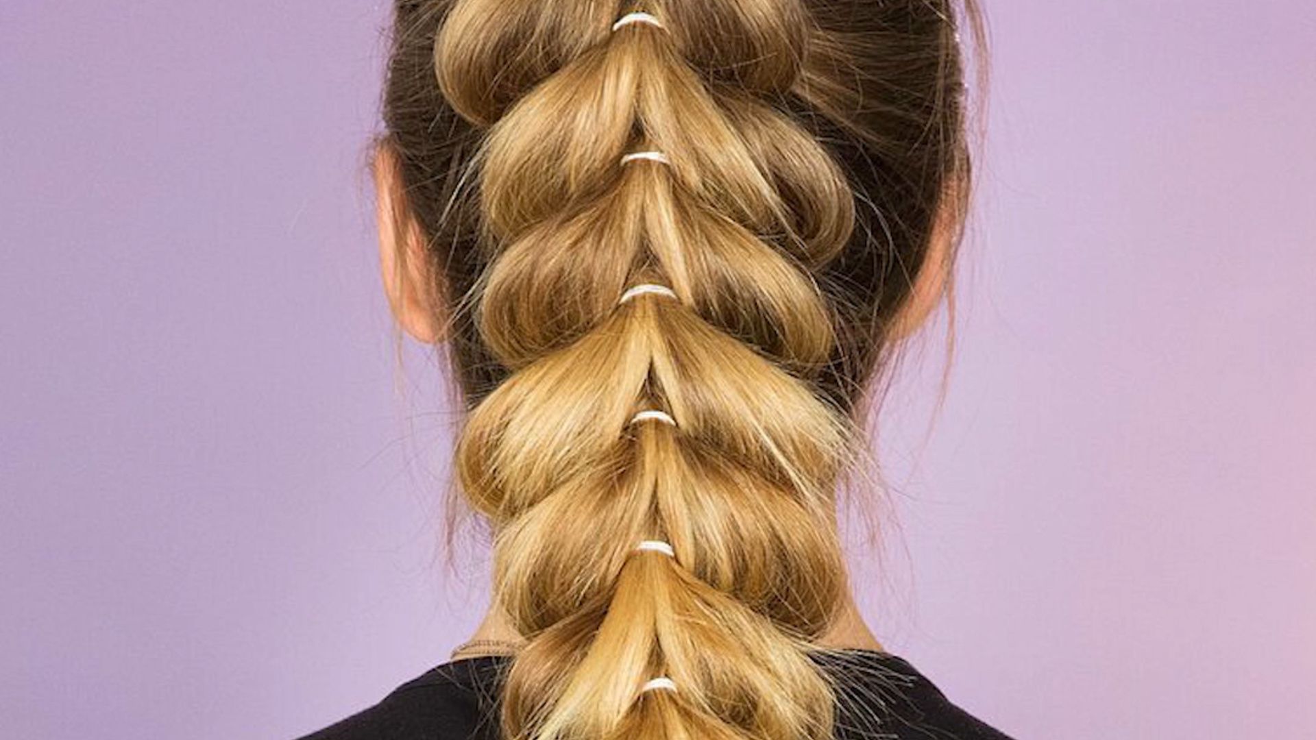 - Теперь выполняйте этот шаг снова и снова, снова связывая две пряди вместе резинкой для волос и протягивая еще две через петлю