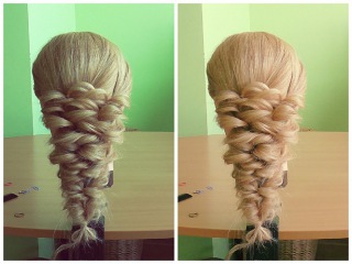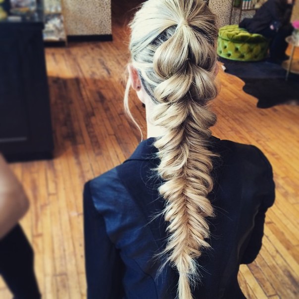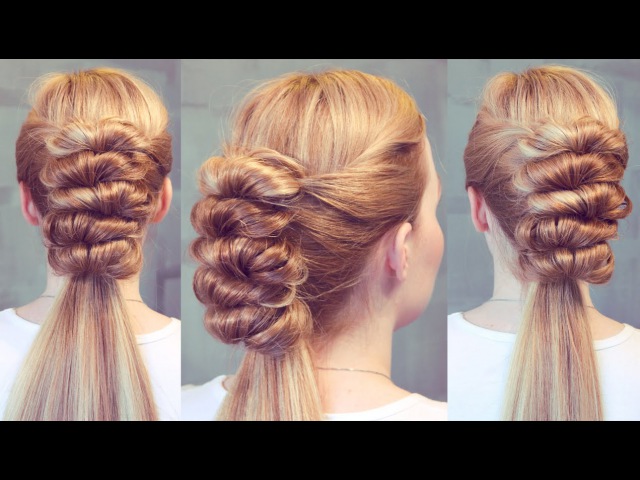 Конец фиксируется резинкой; - С помощью рук вытягиваем немного волосы из общей конструкции для придания прическе объема.